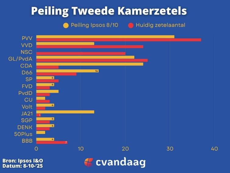Dat CDA een enorme winst gaat halen, lijkt vrijwel zeker. De partij van Henri Bontenbal staat op dit moment op 24 zetels in de peilingen en zou daarmee ineens de tweede partij van het land worden. Dat is knap aangezien CDA bij de verkiezingen in 2023 slechts vijf zetels wist te behalen. De PVV blijft ook in deze peiling de grootste partij met 31 zetels.