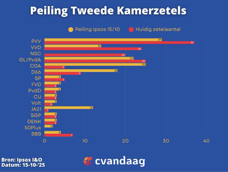 Wat wel behoorlijk zeker is, is de monsteroverwinning van CDA. De Partij van Henri Bontenbal heeft op dit moment slechts vijf zetels in de Tweede Kamer maar scoort is in de peilingen met 25 zetels de tweede partij van het land. Alleen de PVV staat er met 29 zetels beter voor.