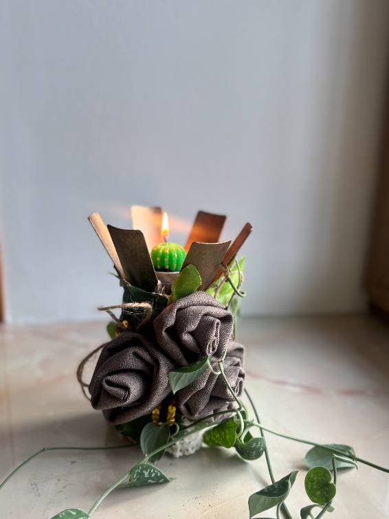 Toch besloot ik het voorwerp te inspecteren. Het was gedecoreerd met kant, opgerolde stof die op een roos leek en sierlijke takjes met groene bladeren. Bovendien stond er een kaars in het midden.